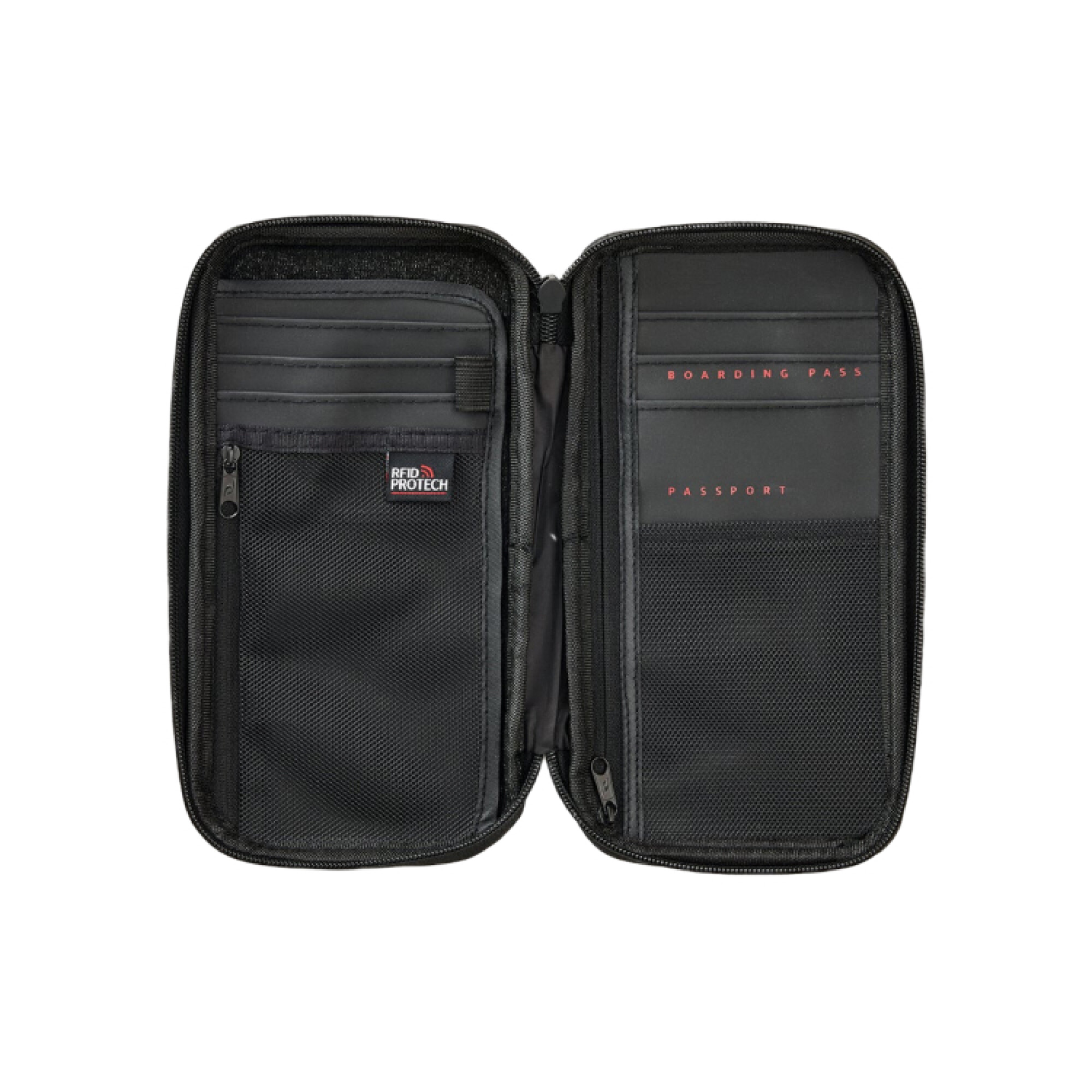 Bolsillos para pasaporte y tarjeta de embarque.